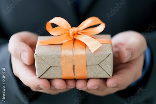 A person holds a beautifully wrapped gift box with an orange ribbon, symbolizing generosity and celebration.