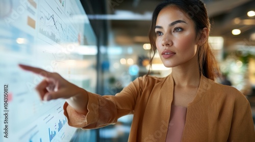 戦略計画のためにインタラクティブ ディスプレイで市場動向を分析するビジネスウーマン