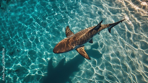 Shark swimming in transparent turquoise water near the shore viewed from above