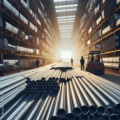 Rows of metal pipes stored in a warehouse, ready for transportation