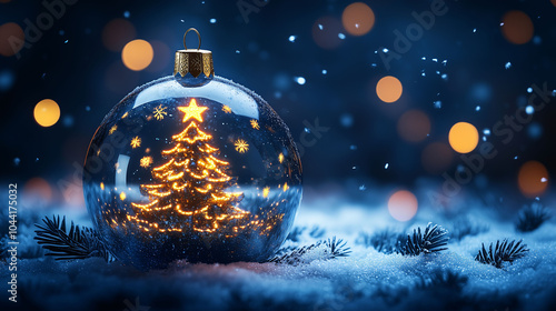 Weihnachtsbaum in einer Weihnachtskugel aus Glas, Gläserne Christbaumkugel mit leuchtendem Tannenbaum, blauer Hintergrund mit Schneeflocken und warmen Lichtern