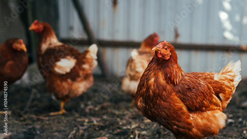 Brown hen wandering in a sunny farmyard among other chickens on a warm afternoon