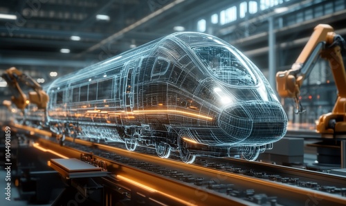 A futuristic high-speed train is being assembled on a production line with robotic arms.
