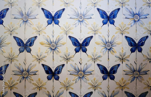 Biało-niebieska, tapeta z motylami i kwiatami. Powtarzający się wzór