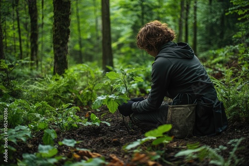 Environmentalist planting a young tree in the forest