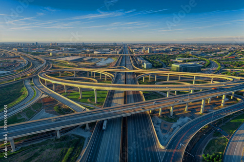 Aerial view Interstate 10 or Katy freeway with massive intersection, stack interchange, elevated road junction overpass in daytime with cloud blue sky. Aerial metropolitan area of Katy, Texas, US.