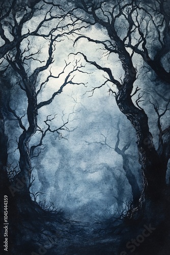 Enigmatic moonlit pathway through the twisted trees of a mysterious forest landscape evoking intrigue and wonder