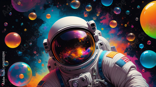 Beautiful painting of an astronaut in in a colorful bubbles galaxy on a different planet. Generative AI. Pop art concept