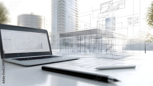 Architectural blueprint and cityscape on laptop computer in a modern high tech office workspace with skyscrapers in the background