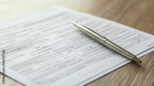 Filled-out form with silver pen placed on wooden surface