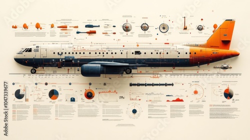 Infographic depicting an airplane with detailed specifications and data visualizations.