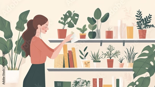 A young woman wiping down a shelf filled with plants and books in a minimalist, modern home, her focus on cleanliness, with a bright and organized interior in the background