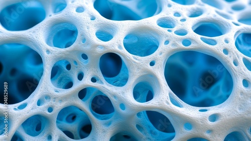 Detailed macro shot of a blue, porous sponge-like structure, showing intricate network of holes and textured surface.