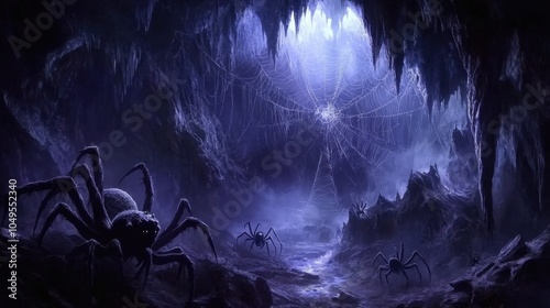 Dark cave filled with massive spiders in webs, spooky night scene with chilling, fear-inducing vibe