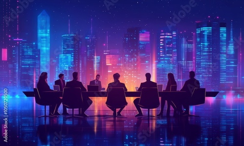 Project Governance and Oversight with Sponsors and Steering Committees in a Modern Cityscape, Night Meeting, Generative AI