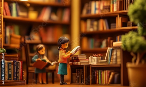 Miniature dollhouse with a girl reading in a library.