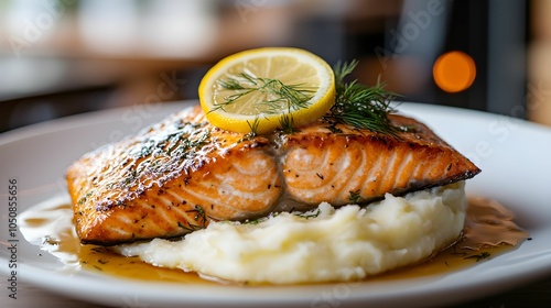 łosoś pieczony, sos koperkowy, puree ziemniaczane, nowoczesne wnętrze, niska przysłona, Canon EOS R5, elegancka prezentacja, świeże zioła, danie główne, kulinaria, zdjęcie, tło, zdrowa ryba, delikatne