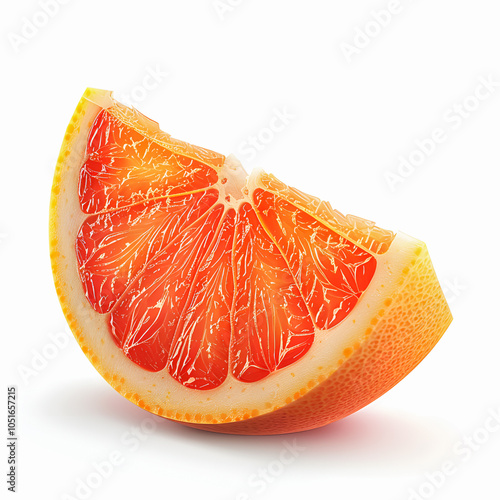 Soczysty plaster grejpfruta na białym tle, przedstawiający intensywnie pomarańczowy miąższ z wyraźnymi błonami komórkowymi.