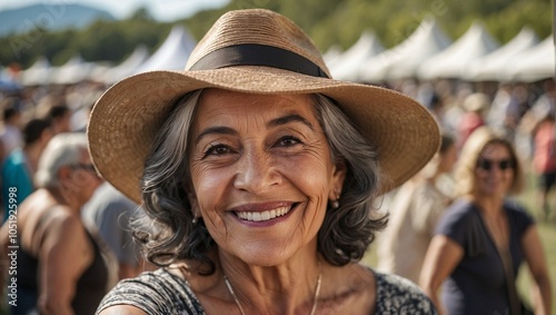 Smiling elderly woman with gray hair wearing a sun hat at an outdoor festival.