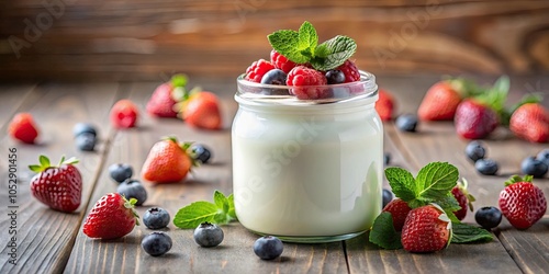 Natural organic yogurt in a glass jar topped with fresh berries, healthy and sustainable food product, organic, yogurt, glass jar