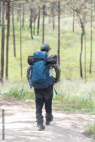 Man hiker relaxing on mountain nature landscape standing mountain outdoor adventure and leisure travel and relaxing destination in nature park vacation travel