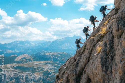 Four Climbers Ascending a Rocky Mountain Face