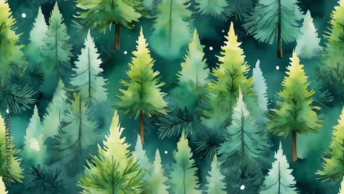 Vibrant watercolor painting of evergreen trees in a lush forest background