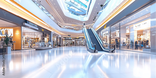 Luxury shopping mall with modern escalator in a modern business plaza building.