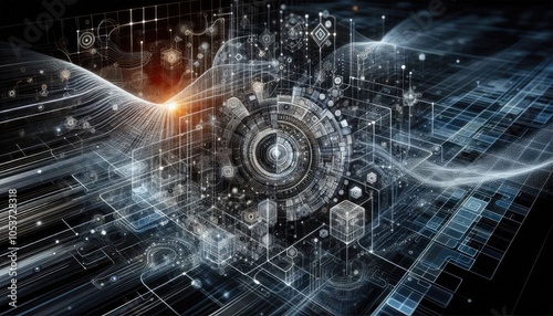 Detailed Abstract Digital Illustration of Machine Learning with 3D Geometric Shapes, Data Layers, and AI Algorithms in a Futuristic High-Tech Style