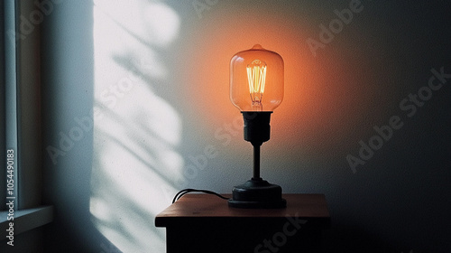A warm glow emanates from a vintage lamp on a wooden table next to a window, creating a calming atmosphere with soft shadows playing on the wall