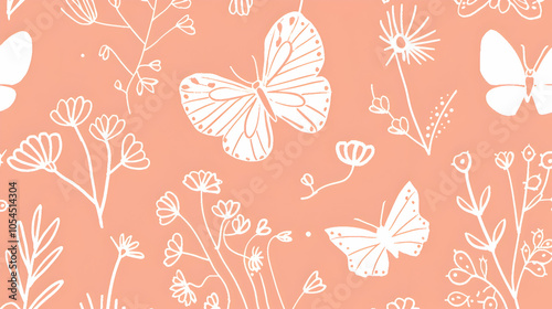 A subtle pink background with dainty white outlines of floral and butterfly motifs, arranged in a light, airy pattern for an effortlessly elegant look