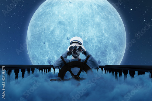 Digital composition of a helmsman with binoculars and cap over night clouds viewing to the starry sky
