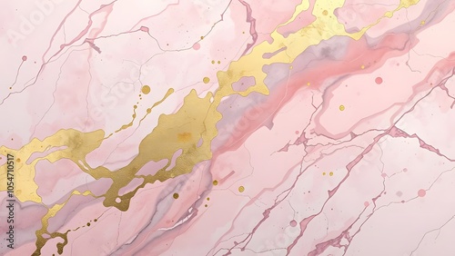 An abstract background featuring a soft, dusty blush pink watercolor effect, enhanced by delicate golden splatters for a luxurious touch. Subtle, artistic illustrations of roses are gently woven into