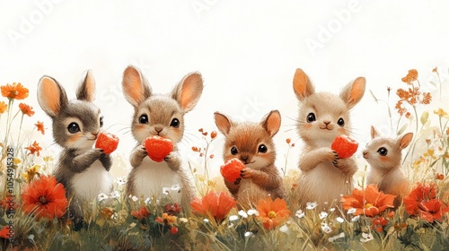 Five Adorable Bunnies Enjoying Red Berries in a Field of Flowers