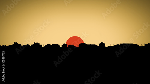 Sunset / sunrise over the suburbian roofs. Dark skyline in the backlighting.