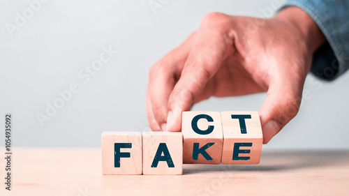 Flipping Wooden cube block for change fake to fact , news and social media concept.