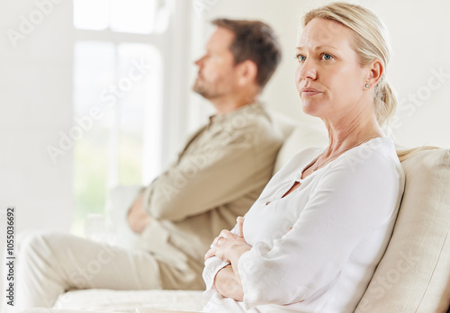 Woman, couple conflict and silence in home, toxic relationship and frustration with husband. People, fight and ignore man in living room for mistake or marriage fail, divorce and drama of betrayal