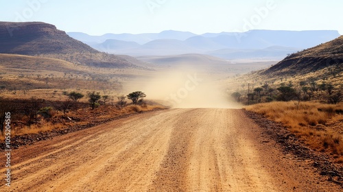 A lonely road through an arid region, dust swirling in the air as the dry wind sweeps across the cracked earth