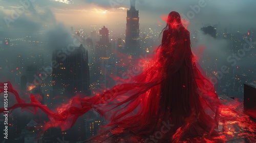 Against a backdrop of towering skyscrapers and swirling fog, a haunting figure in vivid red embodies an otherworldly presence, captivating the twilight sky