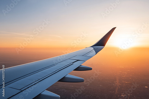 Airplane wing against a beautiful sunset view from the sky.