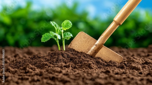 Gardening Tools and Green Plant in Soil Close Up
