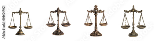 Collection of ornate vintage scales of justice, symbolizing fairness and law, isolated on a transparent background