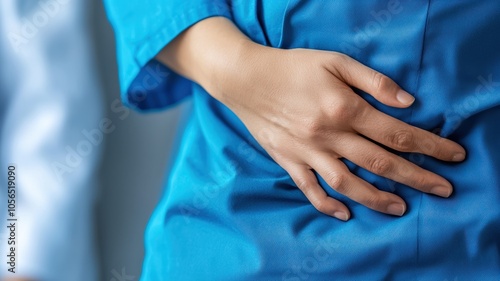 A person in blue attire is holding their abdomen, indicating discomfort or pain.