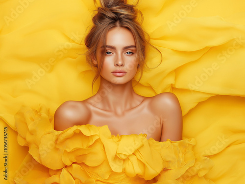 Piękna kobieta cała ubrana na żółto na żółtym tle