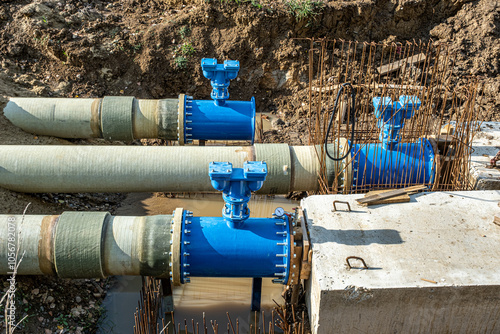 New fiber glass water pipeline in trench. Replacement of old rusty tubes by new one