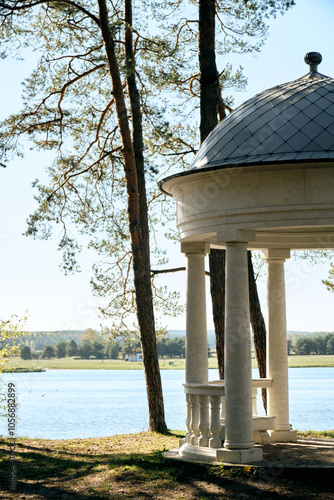 Tranquil park rotunda by lake, serene nature scene with sunlight filtering through trees