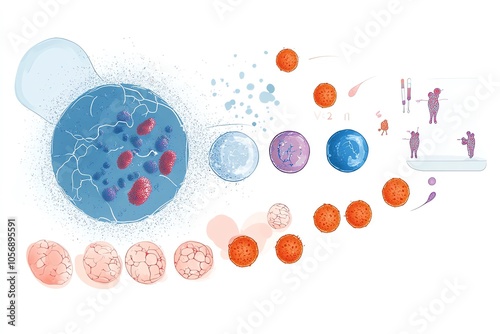 Illustration of embryonic stem cell development stages, showcasing diverse cell types and scientific exploration in biology.