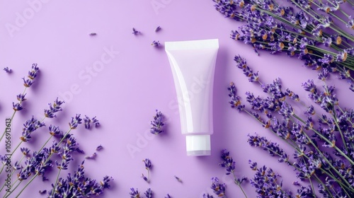Lavender infused cosmetic cream in a tube Moisturizing formula featuring lavender on a purple background