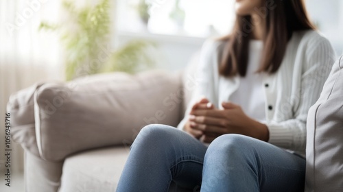 A young woman sits comfortably on a sofa, lost in thought, surrounded by natural light and a soothing atmosphere.