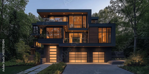 moderne Architektur im Wald bei Nacht mit warmem Licht